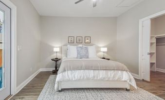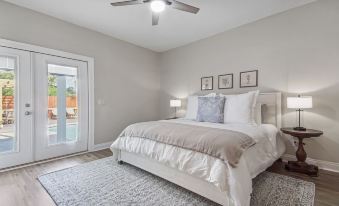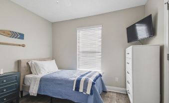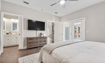 The main floor master bedroom comes with a king bed, walk-in closet, attached bathroom with separate tub and shower as well as access to the pool and deck. Off the hallway from the master bedroom is the laundry room with full size washer and dryer.