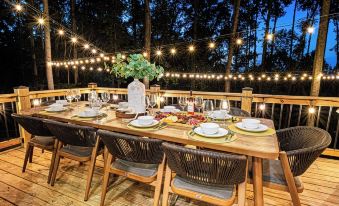 The outdoor area offers a huge wood burning firepit with built-in seating benches where your entire group can hang out, plus a large dining table on the upper deck for al fresco dining.