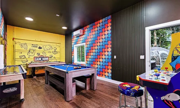 Discover Lamplighter House, a luxurious 4BR, 3BA retreat just 15 minutes from downtown Asheville, NC. This mid-century modern gem sleeps 15 and offers endless entertainment with a game room, home theater room, sauna, hot tub, and geo-dome.