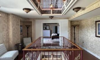Up the stairs to the second and third floor private full suites, you are enclosed by wrought iron railings and a stone wall fit for a castle. Both private suites have full bath and closets, electric fireplaces, and private balconies that overlook the Blue Ridge mountains and north end of Luray.