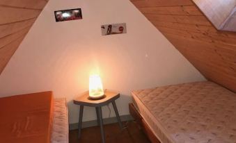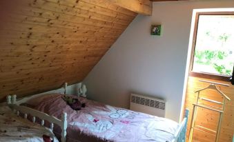 Demi chalet avec 2 wc, 2 chambres au premier étage et une sous les toits, idéale pour des enfants (comme une cabane) avec un accès difficile. Une échelle verticale qui mériterait un barreau de plus tout en haut pour faciliter l'accès.