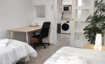 The decor is clean, modern, fresh, and relaxing. The open kitchen is fully equipped with a sink, dryer, dishwasher, refrigerator, glass-top stove with oven, and microwave. The beds, mattresses, and pillows are comfortable, both queen and single size.