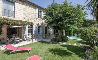 Stone townhouse exposed in Maillane in the center of the village, including a large, very bright living space thanks to its large openings overlooking the garden to the south and its superb swimming pool heated on demand.