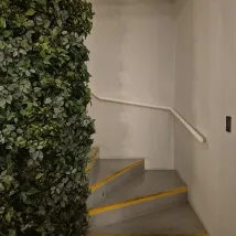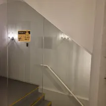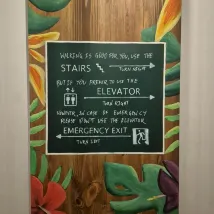 Au sol, des repères créatifs pour les entrées et sorties, accompagnés de petits mots mignons et d'incitations à emprunter les escaliers, sont disposés.