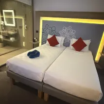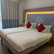 141125. This superior twin room offers ample space. The room does not have a prayer mat for Muslims. To iron, must contact room service. The room is completely covered in carpet. The room does not have bathtub. The bathroom design is modern, especially the doors.