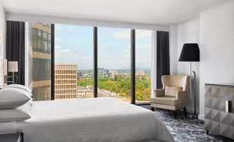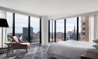 Suite d'angle avec 1 chambre, lit King Size, vue sur la ville et balcon en étage élevé