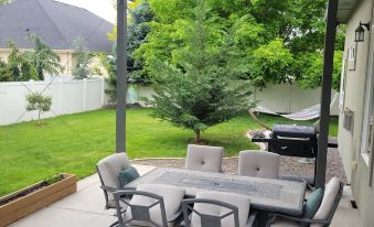 Relax or entertain in the covered patio area featuring propane fire pit tables, outdoor dining tables, and comfortable seating. Fire up the backyard BBQ grill and enjoy a meal with friends or family in the large fenced yard, ideal for gatherings and quiet evenings alike.
