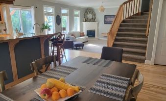 • Spacious chef’s kitchen fully equipped for cooking and entertaining, with modern appliances, ample counter space, and a kitchen bar for casual dining or morning coffee