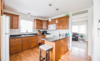 The living room has a 75 inch screen tv and a dual reclining genuine leather couch. So you won't miss out on game day.. Enjoy access to our fully equipped kitchen to make all of your meals in house if you so choose! A coffee station including travel cups, sugar, tea and coffee is provided, along with access to full size washer and dryer if you need to do laundry during your trip.