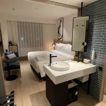 The hotel is like brand new. The room is spacious and clean. The staff were extremely helpful. Perfect for travelers with rental car.
