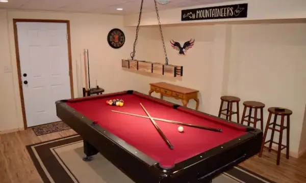 Come downstairs to the recently renovated finished basement. You will walk right into the full size pool table and around the corner a foosball table for hours of family fun! NEW for 2025 arcade table with 60 classic arcade games such as Pinball and Frogger for hours of fun, 2 player mode available on some games. Let the little ones relax and play in the available play space with a light up tippee, books, toys, and games. After a game or 2 of pool relax on the couch or recliner and take in a movie on the TV. Another bedroom is downstairs with a queen bed and a desk with an attached half bath.