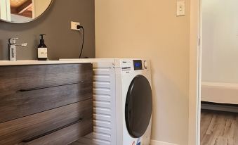 There is a full kitchen so you can cook your meals if you wish too. There is also a clothes washing machine in the bathroom so if you have been away from home for a while you can get your clothes all nice and clean again during your stay.