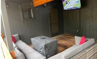 Caribou Cabin Outdoor Deck w Firepit Table & TV