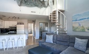 An adorable spiral staircase leads to the lofted bedroom and full bathroom above. Offering a queen bed, dresser, swivel chair, TV, air mattress, vaulted ceilings and skylights, this room is sure to delight guests of all ages.