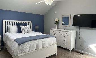 The main level has the master bedroom, abutting a full bathroom, is newly furnished with a Queen-size memory foam mattress, dresser, nightstands with usb ports, swivel rocker, and a smart TV.