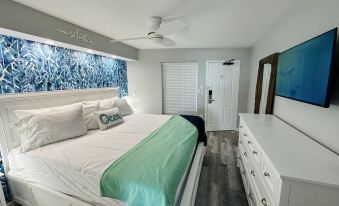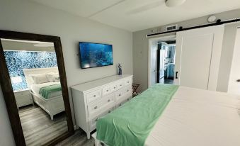 Bedroom: King bed, two nightstands with lamps, large dresser, floor length mirror, ceiling fan, and 42" smart TV with streaming services and cable. Larger guest closet (smaller closet is reatined for owner storage).