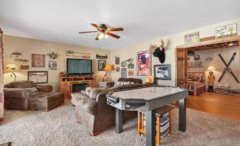 For those looking for another cozy hangout, head downstairs to "The Retreat" a perfect mix of relaxation and fun. This spacious, well-decorated area is where friendly competition meets comfort. Challenge family and friends to a game on the air hockey table, or kick back and enjoy a movie or the big game on the enormous 75” 4K TV. Want the ambiance of a fire without the hassle? The electric fireplace offers the warmth and cozy feel of a fire at the touch of a button. Whether you're winding down after a day outdoors or seeking some downtime indoors, this space is a family favorite for casual evenings or late-night fun.