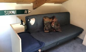 There is a 1/2 bath on the second floor and a stair to the 3rd floor with a futon which folds out to a double bed.
