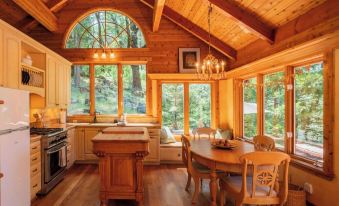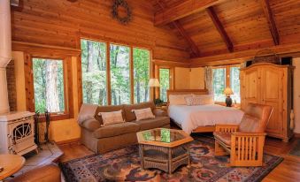 The luxurious one room cabin has wooden beam ceilings and floors, surrounded by windows with green tree-filled views and creek frontage. It boasts a fully equipped kitchen and everything needed to cook a gourmet meal. Down bedding with 100% cotton linens. French doors open onto multi-leveled decks (hot tub) overlooking the creek. It is THE place to relax and recharge in serene beauty and comfort.