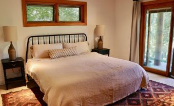 There are four bedrooms in the main house and an optional separate studio to rent. (Note the description says this is 5 bedrooms-- so if only renting the main house you are renting 4 bedrooms, or you can optionally add the studio for a fifth bedroom.) The main house has two bedrooms with king beds, one bedroom with a twin bed and a twin air mattress (if needed but please request ahead of time), and an enclosed den with a queen murphy bed. This allows 8 people to sleep comfortably in the main house (more with the studio if needed-- see below). There are 3 bathrooms in the main house, one with a lux freestanding soaking tub with forest views.