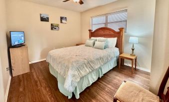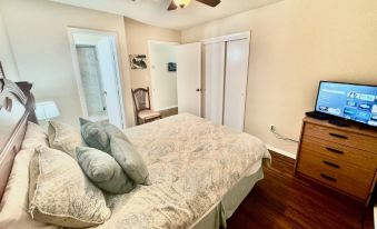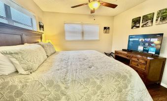 The fully equipped kitchen has everything you need to prepare delicious meals during your stay, whether it’s a hearty breakfast before heading to Schlitterbahn or a relaxing dinner after a day on the river. The master bedroom features a comfortable queen-size bed, its own television, and a private en-suite bathroom with a tub/shower combo. The guest bedroom offers two twin beds and a TV, perfect for friends or family. The remodeled guest bathroom boasts a stylish walk-in shower with beautiful tile work, adding a touch of luxury to your stay.