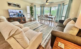 This beautiful 2-bedroom, 2-bathroom condo offers stunning views of the Comal River, with floor-to-ceiling windows that let in plenty of natural light. The master bedroom has a new King Bed and mattress! The quest bedroom has a Queen bed. The spacious living room is designed for comfort, featuring a cozy loveseat, a flat-screen TV, and a queen sofa sleeper—perfect for extra guests. Gorgeous wood floors run throughout the condo, adding warmth and charm to your home away from home.