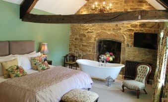 The spacious Annex drawing room has luxury sofas and a feature fire place with log burner for those colder nights . There is a fully fitted kitchen with all the necessary amenities and ground floor bathroom and toilet.