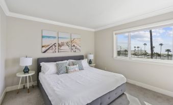 Enjoy the amazing beach, ocean, and Catalina views right from your private balcony, master bedroom, and family room with a sleeper sofa. The layout of this home showcases dual master bedrooms with en-suite bathrooms. The bedrooms are on opposite ends of the unit and are separated by in home laundry, perfect for multigenerational living, a roommate, or a shared vacation home. The dining room features a large sliding door, allowing for bay views and ample natural light throughout. From the front door and dining room, you are able to peer through the kitchen and family room out to breathtaking ocean views. The remodeled kitchen features bar seating, quartz counters, stainless steel appliances, skylight, and ample counter and cabinet space. The kitchen is open to the family room which is perfect for entertaining. The spacious family room with a sleeper sofa, also enjoys access to the balcony and fresh beach air.