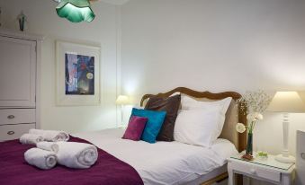 A couch for two sits in front of the flat screen TV, along with a large coffee table. There is a comfy antique reading chair with reading lamp, and a lovely lilac wall to soften the mood. A mix of original artwork and Chagall reproductions, bring originality and colour to the décor.