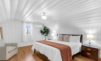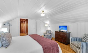 Spacious and cozy with a king bed, smart TV, two comfortable armchairs perfect for reading, a dresser, and a clothing rack.