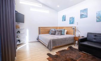 This secret gem is designed for entertaining. A giant 65 inch (internet connected) HD TV graces the living room wall. A second (internet connected) TV is furnished in the master bedroom. The Kitchen has granite counter tops and sparkling stainless steel appliances including a Kuerig Cocoa/Coffee maker. Grab your favorite drink from the complimentary beverages supplied in the refrigerator. The unique custom corner window in the dining area provides a view of the back yard grilling area. A 1/2 bath is tucked under the staircase for a quick wash and clean up before sitting down to eat your fish catch of the day. The home is so open and beautiful that guests may forego adventuring to sit down with a good book or spend the afternoon lounging in a zero gravity chair on the upper deck. The master bedroom has a walk in closet, a roomy king bed, and a twin bed concealed under the loveseat if needed. The second bedroom has a queen bed and a full sized pull out bed is located downstairs.
