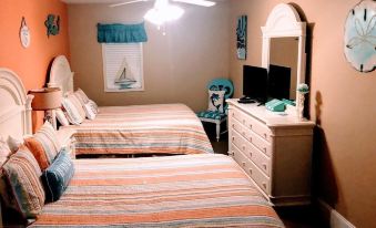 This condo is actually on the first floor of the building as the 1-4th floors are the parking garage (free parking woo-hoo). Park on the 4th floor and take the stairs to your condo or take one of the 4-high speed elevators. (one family per elevator - for social distancing). Large patio with an ocean view has plenty of comfy seating to enjoy the smells, sounds and view of the ocean and is located off the living area and also the main bedroom suite. The main bedroom has a King bed with its own large bath room with a jetted tub and walk in shower. 2 more guest bedrooms for your crew of mermaids and pirates! Each guestroom is equipped with 2 queen beds and one has a private bath. The resort amenities are open and waiting for you and yours to enjoy!About pets:No pets allowed.About checkOut:Check out before 11:00 AM.About children:Children allowed: ages 0-17.Primary guest must be 25 years of age or older..About checkIn:Check in after 4:00 PM.About smoking:Smoking is not permitted.About minBookingAge:Minimum age to rent: 25.About events:No events allowed.
