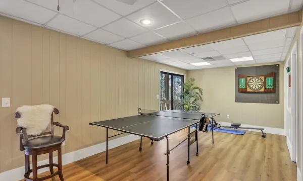 gas grill for an al fresco BBQ dinner surrounded by nature. Capture unforgettable moments as the sun dips below the horizon, painting the sky with vibrant hues. If you prefer to stay indoors, the stylish living spaces await, complete with smart TVs for movie nights or your favorite shows. Still feeling energetic? The basement offers endless fun with games, puzzles, books, darts, and ping pong, perfect for family bonding or friendly competition.