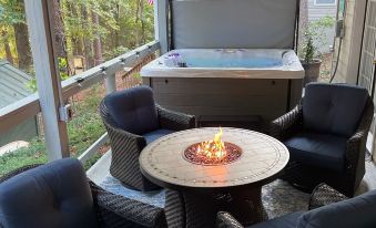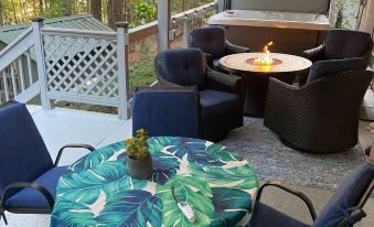 Large gas grill and two porches for outside dining, and nice Charcoal grill. Hot tub and gas fireplace on lower patio with sitting area.