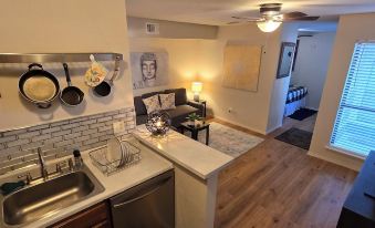 Enjoy a stylist, modern experience in a fully furnished UPDATED studio with everything you desire 5 mins from Lake Hefner, the Mall, Bluff Creek (walking, biking trails) and more. Less than 10 mins from Oklahoma City's Premier Entertainment District called Chisholm Creek; Top Golf, iFly, top-restaurants, bars, and more. Free high-speed Internet, flatscreen Roku tv. Comes with washer and dryer! Condo is located in the back with "no road noise!"