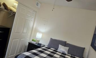 Space includes a full-sized bed but also has a sleeper sofa. Condo is in gated area for your safety. There is community pool but it's open seasonally. Parking is free!