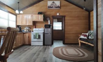 We offer 720sq ft. of space for the whole family. 2 bedrooms with extra cots, walk in closets, stand up shower, washer/dryer, fridge, microwave, full stove/oven, coffee pot, cooking pots, dishware, a/c / heat in each room. Eat in kitchen with Amish made dinette set. Couch folds out to make a bed. Outside smoke-less fire pit with grill option. No pets Unless approved