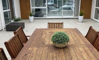 Enjoy the water-views from the deck and grassy lawn, or retreat to the sheltered interior courtyard with large outdoor dining table and BBQ.