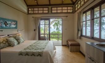 The villa has two master bedrooms, each with a queen bed, coffee bar, refrigerator, ensuite bathroom and air conditioning. Between the two bedrooms, there is a spacious living room with fans, dining room, kitchen, and a full bathroom. In this space there is a sleeping loft for two guests. The villa comes with bed linens, bath and beach towels. You will find breakfast goods in your private kitchen: eggs, bread, granola, local fruits, yogurt, orange juice, milk, coffee and tea.