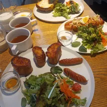 Il est très proche de la station de métro Higobashi et juste en face de la station de métro Yodoyabashi. La salle est très grande et neuve. Cependant, veuillez noter que même si le petit-déjeuner se termine à 10h00, la dernière commande est à 9h30. cette fois, c'est dommage que nous n'ayons pas pris de petit-déjeuner.