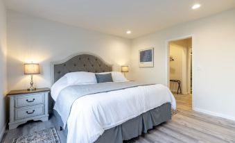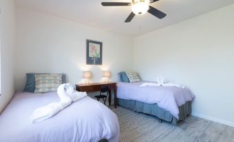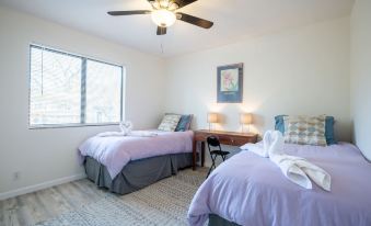 Enjoy a peaceful retreat from the moment you pull into the driveway. Utilize the driveway for parking for up to 2 guest vehicles, along with additional street parking if needed. This charming blue home with lush vegetation is equipped to host 8 guests with 4 bedrooms and 2 full bathrooms.