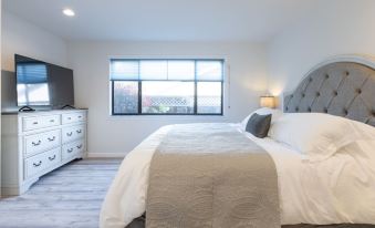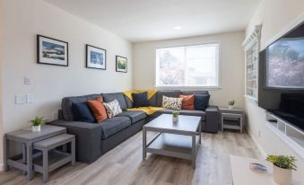 Located just off the seating room is where you will find an open floor plan featuring the kitchen, dining area, and living room. While cooking can feel like a chore, let alone while on vacation, our home is equipped with the basic necessities to eliminate the hassle of it all. However, we recommend exploring local restaurants and cafes which are located within walking distance. Enjoy a meal as a family around the dining table. After a day of exploration and fun, cozy up on the couch and utilize the Smart TV for family movie night.