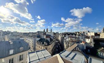 Enjoy the comfort of full air-conditioning throughout the apartment, and find culinary delight in the fully equipped kitchen. The highlight of this residence is its terrace, a perfect setting for romantic dinners, offering an additional 350 sq feet with panoramic views of the city's rooftops and iconic landmarks from the Eiffel Tower to Notre-Dame. This privileged view is exclusively reserved for a fortunate few.