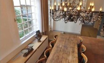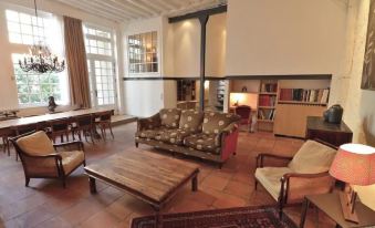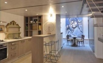 The apartment spans two levels, offering three bedrooms and three bathrooms. The ground floor is home to a large, inviting living room with a cozy fireplace, a comfortable large sofa, two armchairs, and a coffee table, all designed for relaxation and comfort. The living area also includes a library for those who enjoy a good read and an entertainment corner with a TV, DVD player, and an audio system. High ceilings and tasteful decor make the space feel airy and open. Large windows overlook the serene courtyard, adding to the peaceful atmosphere. Adjacent to the living room is a dining area perfect for family meals or hosting guests. The dining table seats 8 comfortably, making it ideal for gatherings.