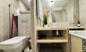 Cet appartement comporte 1 chambre, une cuisine avec un réfrigérateur, un lave-linge et 1 salle de bains avec un sèche-cheveux. Des serviettes et du linge de lit sont disponibles.
