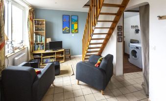 Upstairs two bedrooms, the master bedroom and the children's bedroom with two pull-out beds. At your disposal a library of comics and board games.
