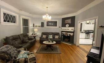 Newly renovated home in historical area. When you open the front door you are greeted by hardwood floors and a beautiful chandelier. Up the staircases you will find 3 queen beds with 2 full baths. Both full baths have separate showers and jacuzzi tubs. Full laundry on second level. Plenty of closet space with a ceiling fan in each bedroom.