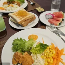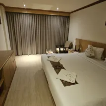L'hôtel dispose d'une belle piscine et d'un ascenseur. Les transferts aéroport coûtent 200 bahts. On est venus nous chercher tard le soir et on nous a déposés en 7 minutes. L'hôtel répond rapidement aux e-mails. Nous y avons passé deux nuits et le ménage a été fait une fois. Tout était lavé, y compris les draps et les serviettes. La chambre est confortable et offre de nombreux rangements. Il n'y avait qu'une seule chaise sur le balcon. Le mobilier n'est pas neuf, mais il est en bon état et tout fonctionne parfaitement. La salle de bain pose un petit problème : l'eau déborde et inonde le sol, et on ne peut rien y faire, même si heureusement il y a une bonde au sol. Le petit-déjeuner est servi à la carte s'il y a peu de convives, ou sous forme de buffet s'il y a beaucoup d'invités. Les œufs sont préparés individuellement, au plat, en omelette ou brouillés, selon vos préférences. Du pain grillé et des saucisses sont disponibles, ainsi que de la pastèque et du fruit du dragon. C'est un repas savoureux et copieux.