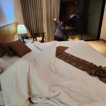 Le personnel de l'hôtel est poli et communique avec les clients. Mais le système de soins en chambre doit encore être amélioré. Il n'y avait même pas une seule serviette. Il y avait des détritus qui tombaient sur le sol de la pièce, la porte était cassée, je suis arrivé à l'école très tard. Fatigué et envie de dormir J'ai dû attendre les serviettes et j'ai quand même dû rester avec le technicien pour réparer la porte.