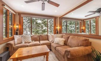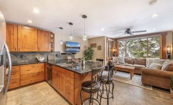 This VRBO is a luxury escape home away from home. We have everything you will need to have a nice and relaxing vacation. From a stocked coffee bar with an espresso machine to a calming sanctuary with aroma therapy and sound machine in the bedroom. This fully remodeled 1 bed/ 1 bath ski in/ski out is equipped with a king Tempur-pedic mattress in the private bedroom. In the living room you will find a queen GEL MEMORY FOAM pull out sofa bed. This condo comfortably sleeps 4 guests, but there is another couch that can accommodate one more guest if needed. There is a high chair for those with little ones. The house will be stocked with a coffee/tea bar for when you wake up in the morning. This kitchen is stocked with all the necessities (spices, oil, good knives (we know how important this is), and condiments). There are plenty of fun games to play with your family if you decide to stay in. The gorgeous remodeled bathroom is equipped with Paul Mitchell shampoo, conditioner and body soap. This cozy ski in/ski out will make you feel right at home! Right outside your door is your own snow park ! There is a big hill that we sled down. We have blow up tubes and a sled for your enjoyment. Check out our Instagram page to see how awesome the sledding is ! This is perfect for kids but so fun for adults as well. This condo is located on the first floor but there are stairs from the parking lot to the complex to get to and from the building. This is not wheel chair accessible